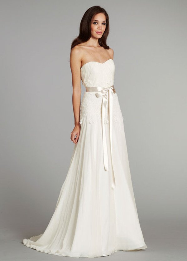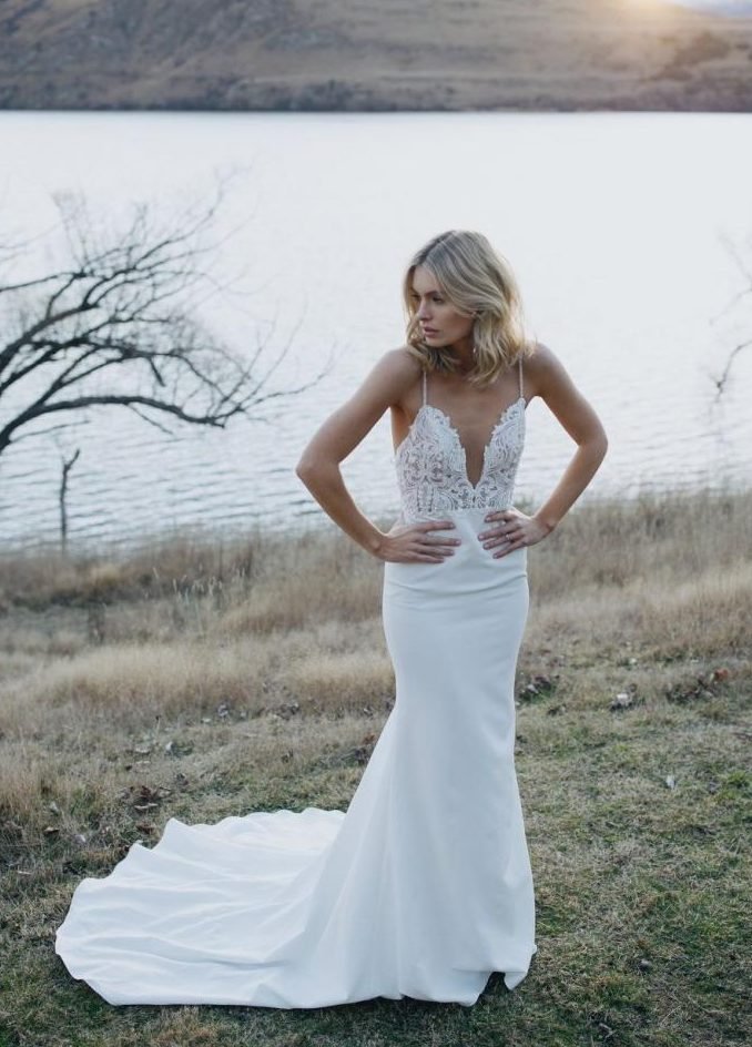 Chiffon is a light-weight, sheer fabric without a sheen. It is easy to move around in and is perfect for daytime events. This fabric pairs well with a flowy A-line silhouette and is an ideal candidate for summer wedding dresses. If a soft, feminine look is what you have in mind then this is the right fabric for you.
