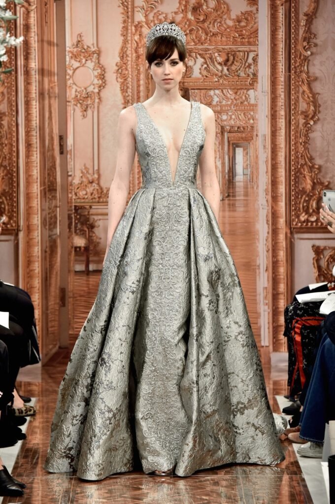 Fabric selection is a crucial step of the gown making process because different fabrics will impart a different look and fall to the same gown. Some fabrics have a glossy sheen to them while others do not impart any lustre to the gown. Similarly, some fabrics are stiff and structured whereas others are soft and flowy, thereby making them more suitable for specific silhouettes. A combination of fabrics can also be used in the construction of the gown, wherein a stiffer fabric is used to impart the desired shape to the gown and a softer fabric is used as an overlay, to impart a delicate finish to the outfit.
